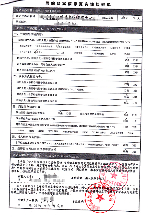 3.網站真實性信息核驗單(藍色部分為企業單位填寫蓋章區,詳情若不懂填寫,只需蓋好公章我司客服部代為填寫)