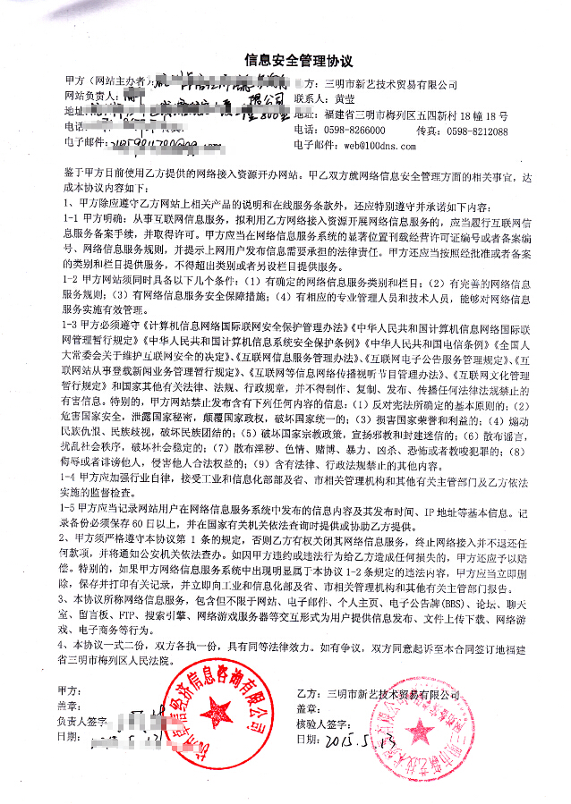 4.信息安全管理協議(打印兩份,網站負責人簽字,蓋公章)