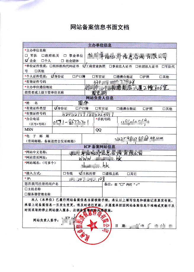 5.網站備案信息書面文檔(星號為企業單位填寫蓋章區,詳情若不懂填寫,只需蓋好公章我司客服部代為填寫)